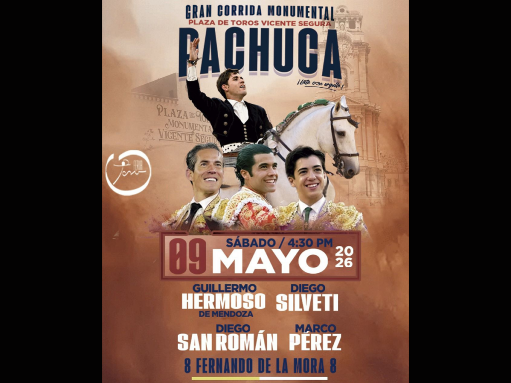 La empresa Feria Toro anunció la realización de la Gran Corrida Monumental, uno de los festejos taurinos más relevantes del año en la capital hidalguense, que tendrá lugar el próximo sábado 9 de mayo de 2026 a las 16:30 horas en la Plaza de Toros Vicente Segura.