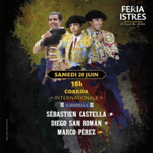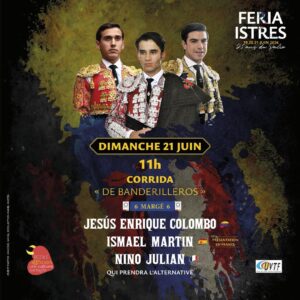 El domingo 21 de junio por la mañana se vivirá una jornada especial con la corrida de banderilleros y alternativa, en la que el francés Nino Julian tomará la alternativa, la quinta que se concede en Istres. Compartirá cartel con Jesús Enrique Colombo e Ismael Martín, frente a toros de la ganadería Margé.