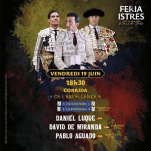 El domingo 21 de junio por la mañana se vivirá una jornada especial con la corrida de banderilleros y alternativa, en la que el francés Nino Julian tomará la alternativa, la quinta que se concede en Istres. Compartirá cartel con Jesús Enrique Colombo e Ismael Martín, frente a toros de la ganadería Margé.